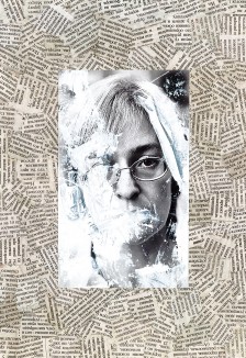 Questo lavoro non si configura come una serie fotografica tradizionale. La fotografia è certamente presente, ma rappresenta solo uno degli strumenti utilizzati. Reggiani recupera dal web i ritratti dei giornalisti uccisi per il loro impegno etico e civile, incollandoli su un fondo di frammenti di quotidiani e riviste in cirillico. È in questo dialogo, spesso aspro e talvolta contraddittorio tra immagine, parola e materia, che l’opera prende forma.