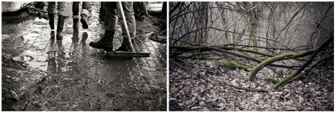 Quella della Memoria è la prima risonanza del portfolio di Raffaella Castagnoli; l’oggetto è l’alluvione in Lunigiana del 2011. L’evento sembra lontano perché catastrofi più recenti si sono succedute. Ma fare memoria vuol dire appunto non ignorare quanto accaduto; perché gli eventi traumatici spesso cancellano col dolore oltre che la fisicità delle cose anche il loro ricordo. I disastri favoriscono lo sbigottimento rassegnato, soprattutto se si susseguono senza sosta, e fanno perdere identità all’evento: i morti e le devastazioni sembrano effetto del destino cinico e baro e vengono archiviati come numeri, almeno finchè non ci toccano in prima persona. La motivazione degli sconvolgimenti è di facile comprensione, nell’urbanizzazione selvaggia e di un territorio ferito che si ribella. E la presa d’atto non basta a cambiare le cose: il rischio è quello di fermarsi a guardare. Raffaella Castagnoli propone due stimoli. La prima chiave interpretativa documenta l’evento attraverso un bianconero reportagistico. La distruzione delle cose “lascia senza parole”. Ma il silenzio è cattivo consigliere in questi casi e la capacità di denuncia che ha la fotografia viene valorizzata. Bisogna far ricordare, cercando di dare stimoli emozionali, chiavi di lettura, opinioni su cui riflettere. Il silenzio è adatto al bosco, non alla città ferita. La seconda chiave è densa di significati. E’ l’auspicio della capacità di mutamento nel rispetto della natura; qui l’autrice si esprime attraverso le “indebite” somiglianze geometriche dei dittici; una natura che riporta tutto simile a sé; c’è l’ironica capacità di osservazione che cerca e mette a confronto composizioni similari: per esempio un’auto ”morta” conficcata in un muretto e una radice emergente dalla sua fonte di vita. La rappresentazione della parte naturalistica del dittico attraverso un colore desaturato, al limite della percettibilità, cerca di evidenziare lo stacco tra ciò che è morto e quello che torna alla vita, quello che è oramai perduto e quello che si può ritrovare.
