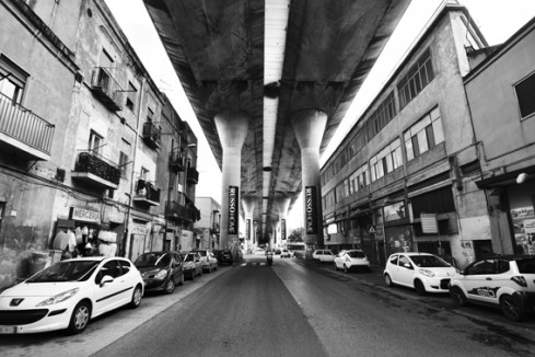 Pubblico e privato quando vanno a braccetto fregandosene degli interessi della collettività creano mostri. Mostri difficili da estirpare perché si replicano per partenogenesi in un ambiente dove il Dio del Male estende le proprie radici in tutte le direzioni dello spazio vitale dell’uomo. Oltretutto è un male scientemente pensato e poi realizzato dall’uomo se l’architettura fin dalla fase progettuale non concede e non riconosce dignità all’indigenza dell’uomo. Due edifici-carcere che si contrappongono e si soffocano a vicenda ed una sopraelevata che entra direttamente in casa ci danno immediatamente il polso della situazione. Ma la replica del male produce mostri con alterazioni genetiche. E dal male architettonico si passa direttamente al male abitativo. Questi di Napoli Est da “nonluoghi” già sulla carta sono diventati direttamente nonluoghi reali senza neanche passare per una fase intermedia. Cosa è un nonluogo? E’ uno spazio dove il singolo individuo non interagisce più di tanto con gli altri individui. Per esempio autostrade, ascensori, stazioni, etc. L’esatto contrario dell’agorà, della piazza, dove gli esseri umani si incontrano e condividono la propria vita. Ecco, Napoli Est doveva e poteva essere un luogo, una agorà umana, invece è stato partorito ed è cresciuto come un nonluogo. Ogni individuo vive la sua razione quotidiana di solitudine nonostante la asfissiante antropizzazione da campo di concentramento. Flavia Menghi riesce a darci un quadro significativo di questi mostri del male ricorrendo sapientemente all’uso della metafora. Reti per i reticolati da campo di concentramento, autostrade per i giardini condominiali, murales aggressivi per l’apologia del male, lampada rotta per la vita senza luce. Nella immagine di chiusura riesce poi magistralmente a concentrare il significato ultimo del suo racconto. La statua del Cristo rotta e semisommersa nella pozza d’acqua e l’automobile di sfondo nel suo mosso infinito parlano senza parole. Sembra che ci dicano: “Qui Dio è morto, l’unica cosa da fare è fuggire. Sì fuggire, ma dove?”.