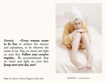 La serie Sacra Bellezza/Sacred Beauty ritraspone la martirologia femminile ambientandola in un presente distopico, in cui le strategie del marketing, rivolte soprattutto a un target femminile, impongono le regole e stabiliscono nuovi rituali sociali. Valentina Ruggiero utilizza la propria immagine per mettere in scena i trattamenti estetici a cui la donna moderna si assoggetta e che servono per rendere più attraente – e spesso maggiormente appetibile – il proprio aspetto. I nuovi rituali di bellezza e gli antichi supplizi delle martiri cristiane, grazie anche all’accurata ricerca iconografica, vengono posti sullo stesso piano: epilazioni, pedicure e lettini abbronzanti rimandano così a decapitazioni, fustigazioni, smembramenti, messa al rogo e altre torture inflitte a chi rifiutava di abiurare la propria fede. Per le stampe, ognuna dedicata a una specifica martire, l’autrice utilizza il formato dei santini, le immaginette votive che a partire dal ‘600 ebbero larga diffusione tra i ceti popolari; sul retro, al posto delle formule di devozione religiosa, vengono riportati stralci dei pervasivi e suadenti messaggi pubblicitari legati alla cura di sé. La serie dalla forte valenza concettuale, presenta diversi sostrati di lettura: dai primi rimandi alle “performance congelate” di Cindy Sherman, l’autrice tocca le problematiche degli stereotipi di genere, fino a interrogarsi sui nuovi idoli pompati da mass e social media. In tempi di selfie compulsivi, in cui i naturali meccanismi di de-costruzione della propria identità vengono soppiantati da afflati di narcisismo, Valentina riflette inoltre sulla deriva dell’auto-og-gettivazione, quella spinta a trattare e promuovere se stessi come un prodotto. Colorito sano, pelle levigata, fisico tonico